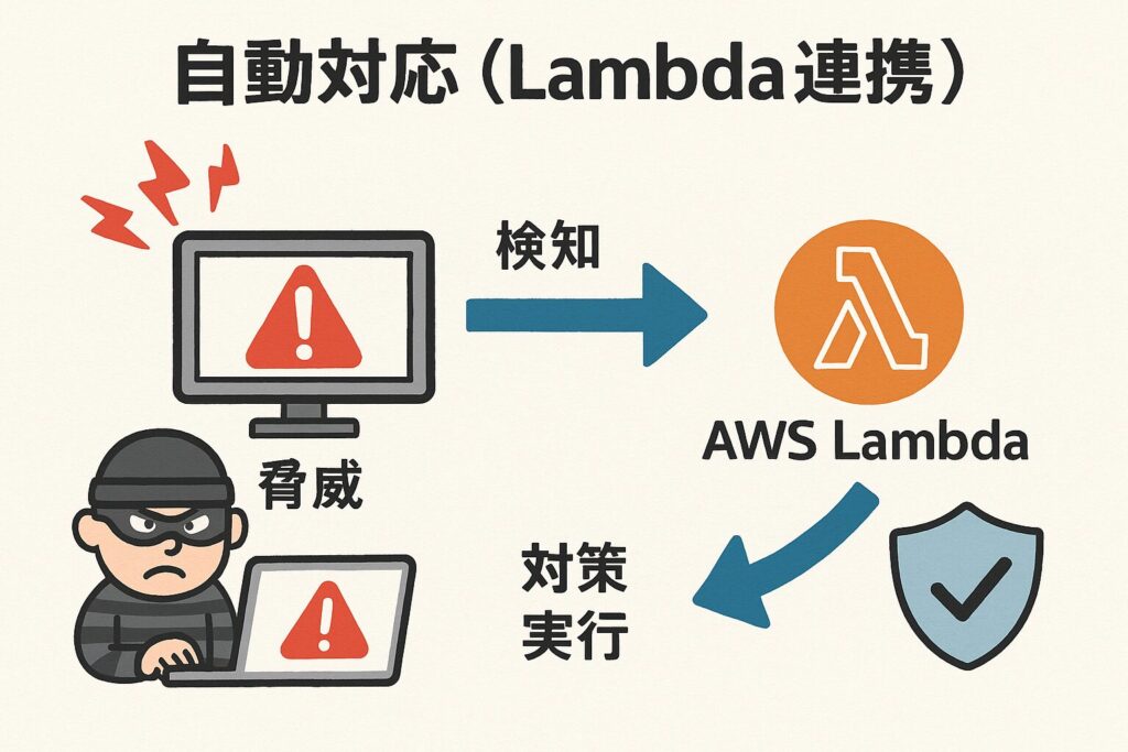 2.異常検出(機械学習) 通常とは違う挙動を学習して検出。内部不正や乗っ取りも早期発見。 3.リアルタイムモニタリング VPCフローログ、CloudTrailログ、DNSログを自動分析。 4.自動対応(Lambda連携) 検出した脅威を自動ブロック。セキュリティ担当者の手間を削減。 5.可視化とレポート 結果をダッシュボードやSecurity Hubで一元管理可能。